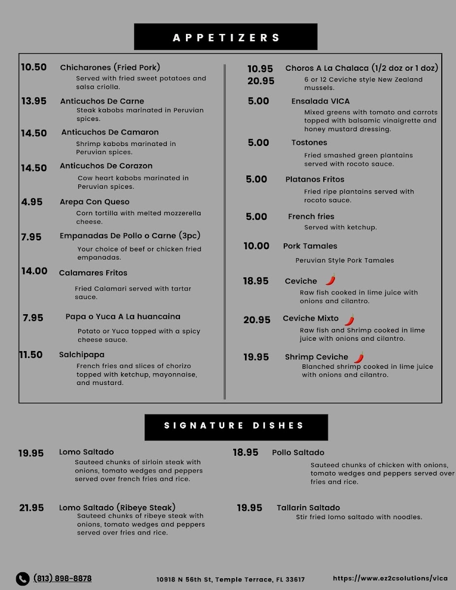 Welcome to Vica Latin Signature, a culinary gem nestled in Tampa, Florida. This inviting eatery specializes in authentic Latin American cuisine, offering dishes that are rich in flavor and tradition. The moment you step in, you're greeted with warmth and a dedication to customer satisfaction, as highlighted by enthusiastic reviews from delighted patrons.
