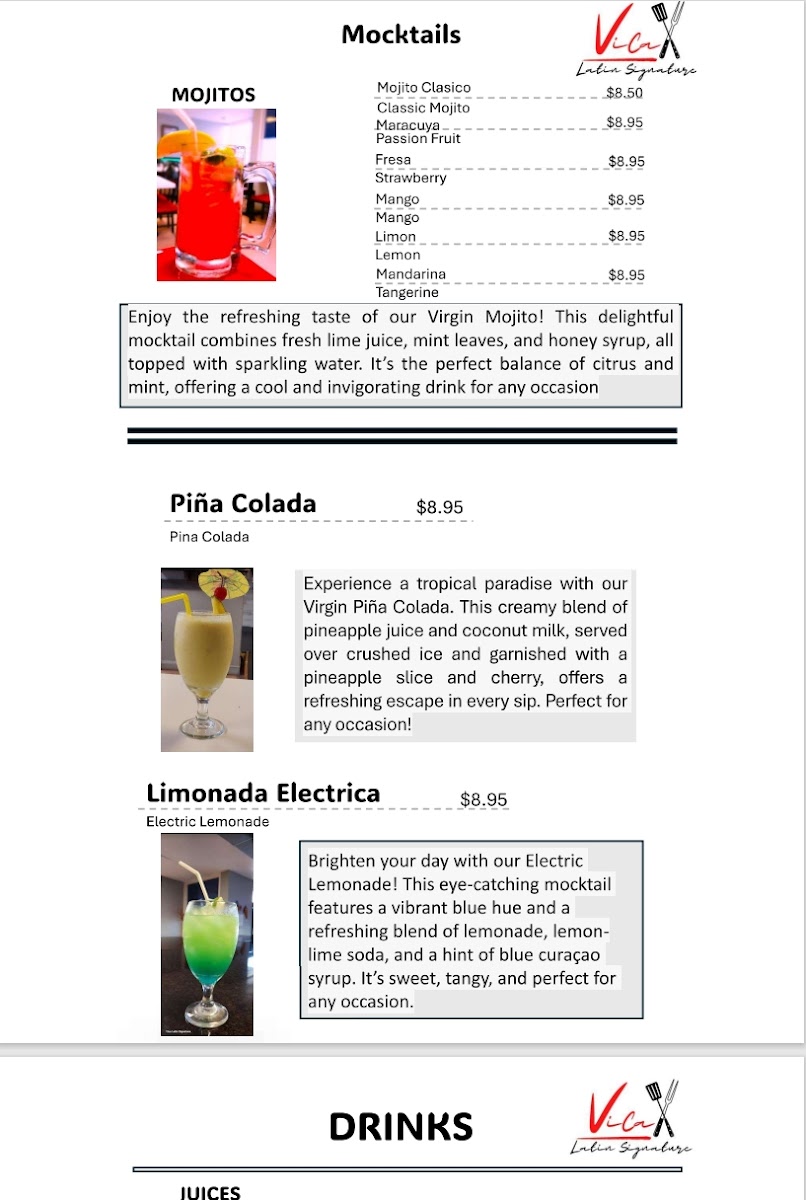 One standout feature is the diverse beverage selection, including their Natural Homemade Juices like guanabana and mango, costing $5.50, along with delightful milkshakes for $8.75. The Mojito Original Mocktail offers a refreshing nod to Cuban traditions, perfect for whetting your appetite.